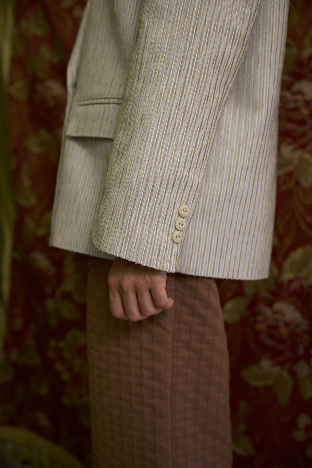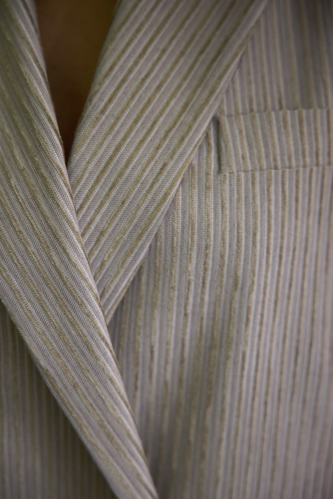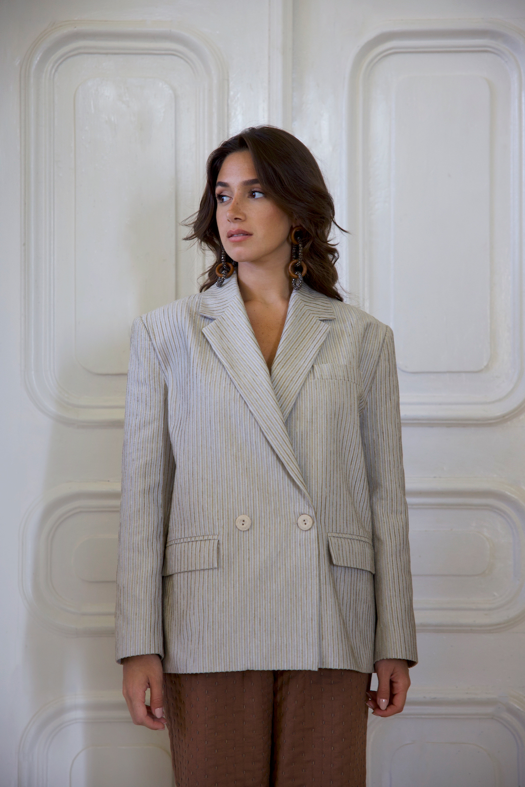 Oversized blazer featuring a light beige striped pattern, long sleeves, welt pockets, and a single back slit.