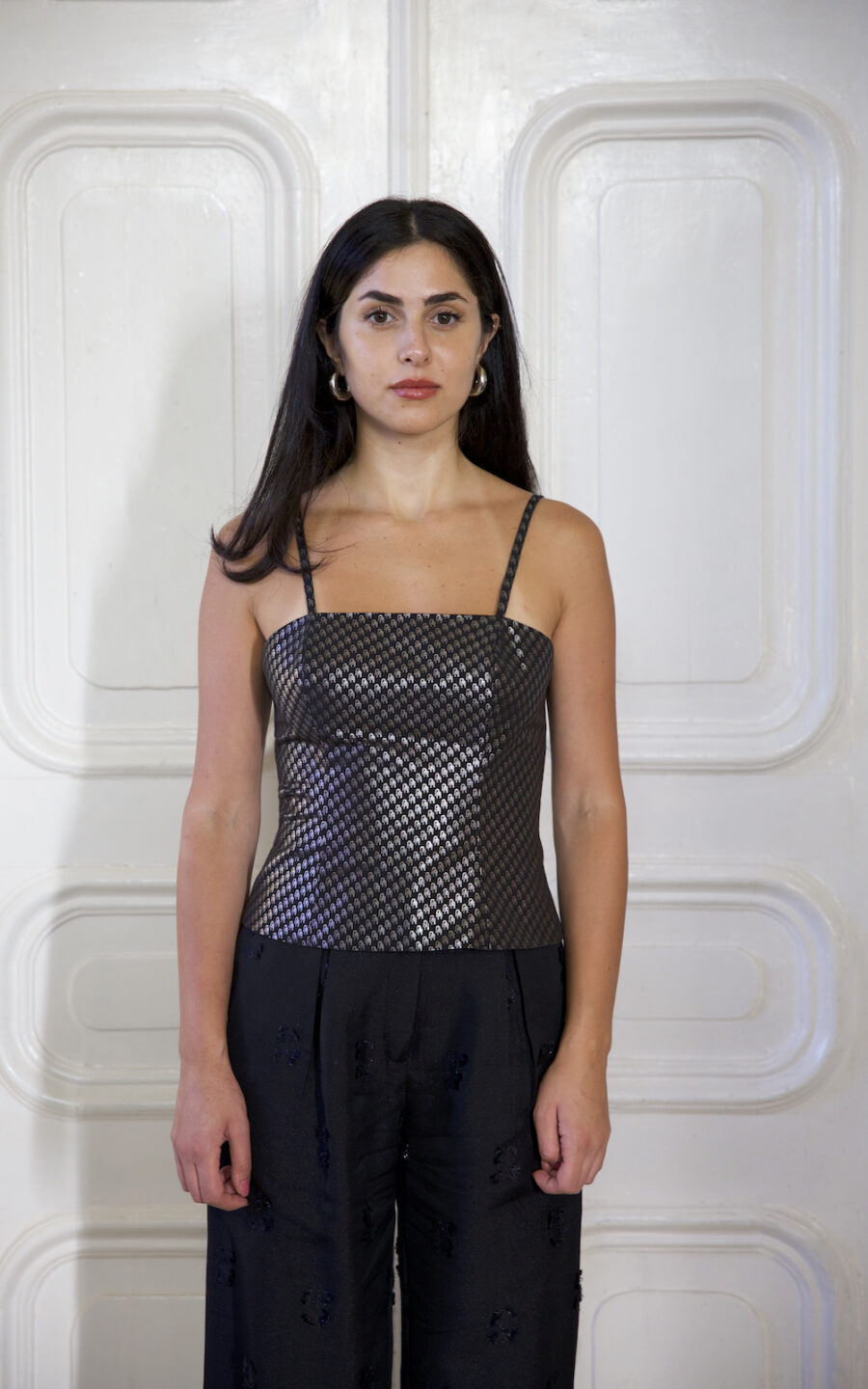Black shorts featuring a center cut-out, front zip fastening, and a flared silhouette.