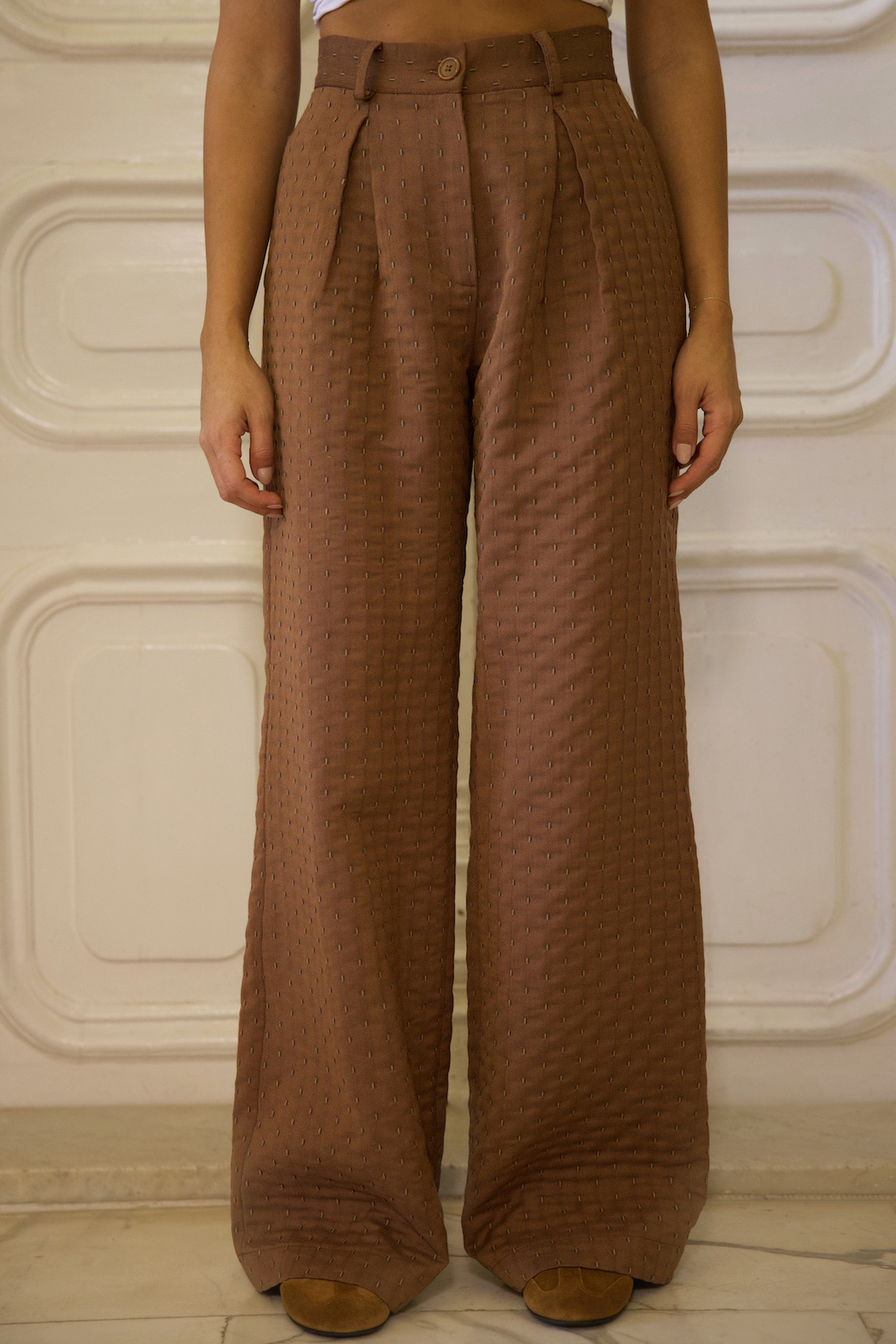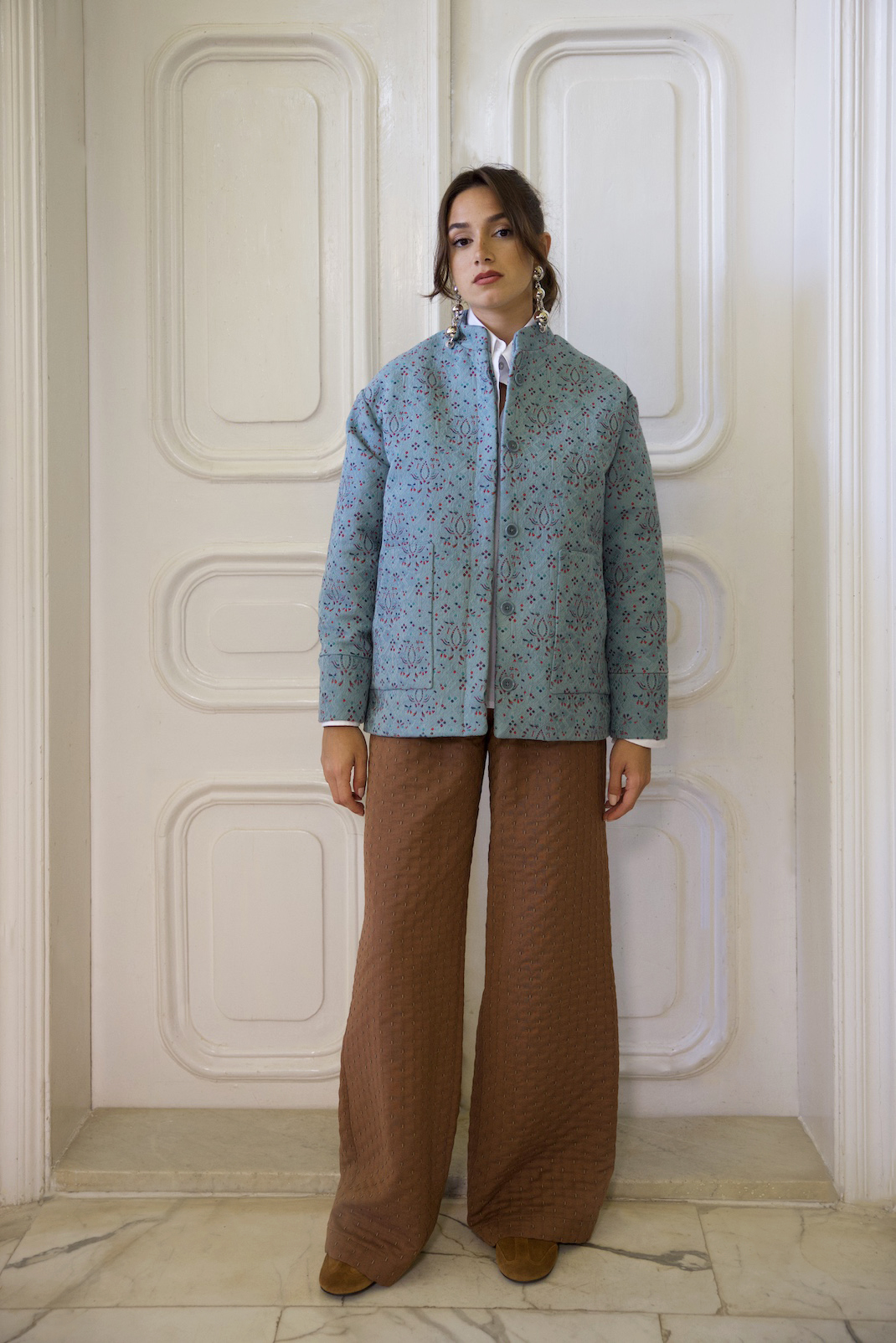 A relaxed, flared silhouette with delicate light-blue embroidery. Designed with two front pockets and one back pocket, these pants combine comfort with subtle detailing.