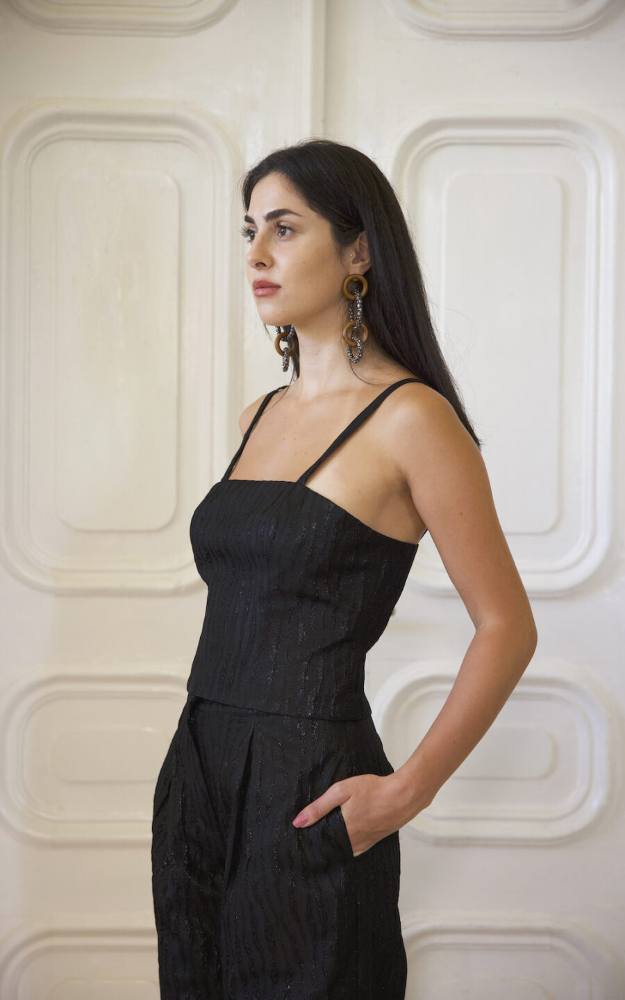 A two-piece set featuring a structured vest and matching shorts. The vest has a V-neck and three front buttons, offering a sleek and versatile look. The shorts are designed with a double V-front detail, a front zipper, and two functional pockets. Both pieces can be worn together as a coordinated set or separately for effortless styling.